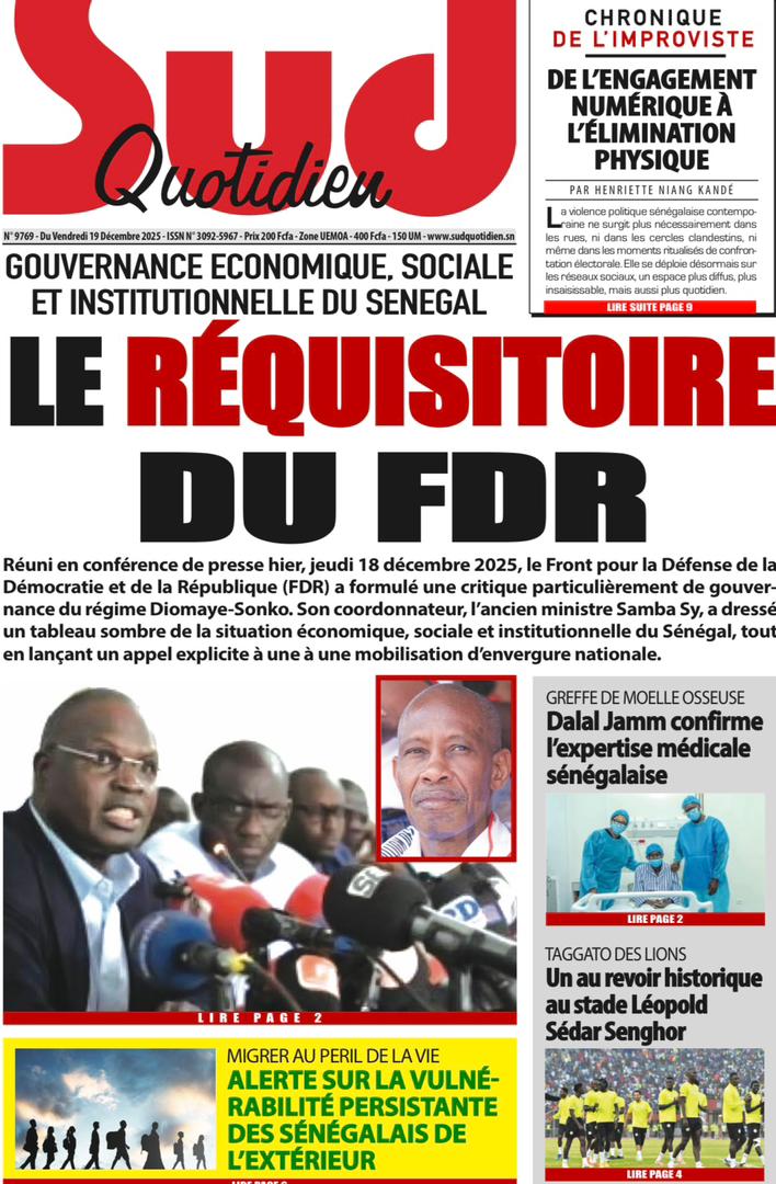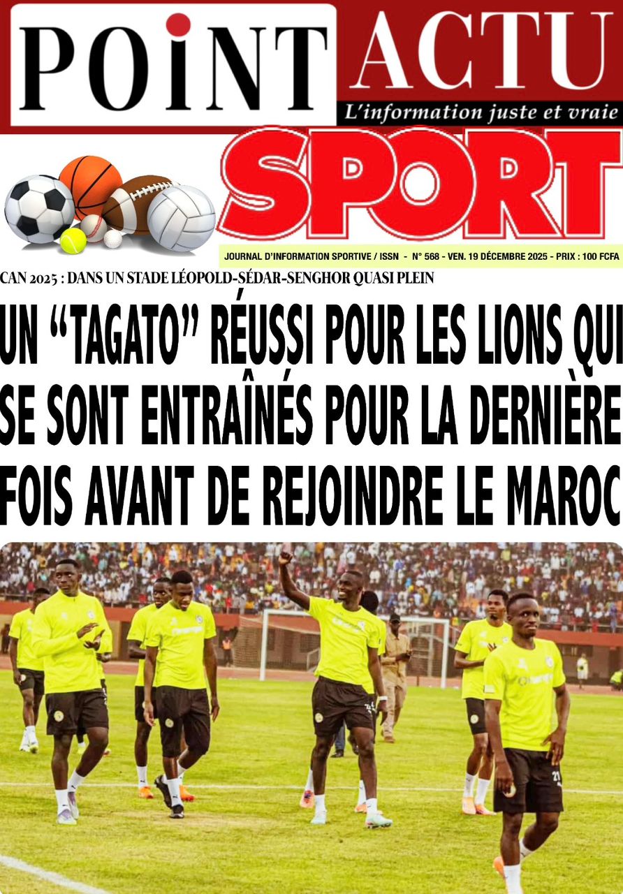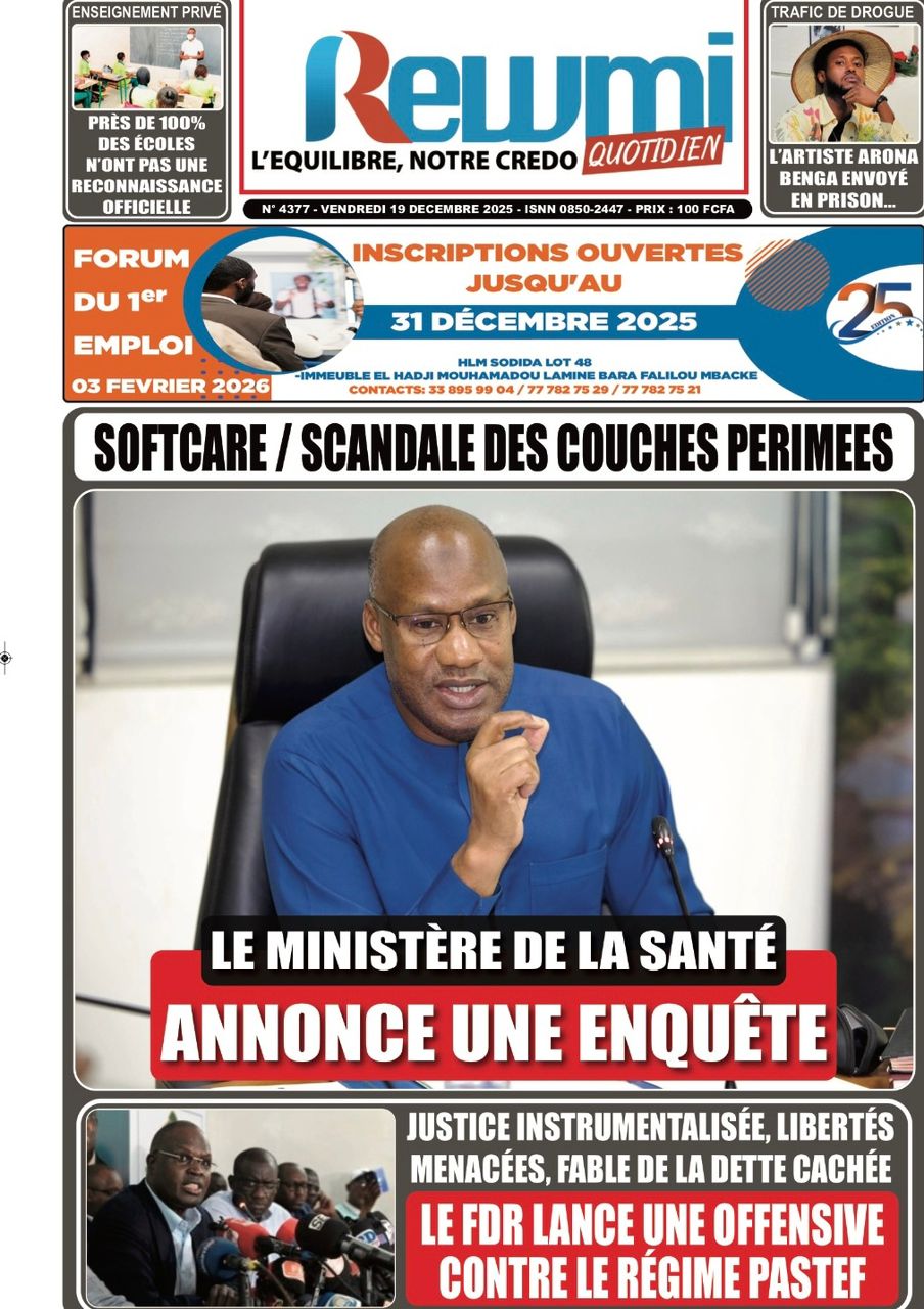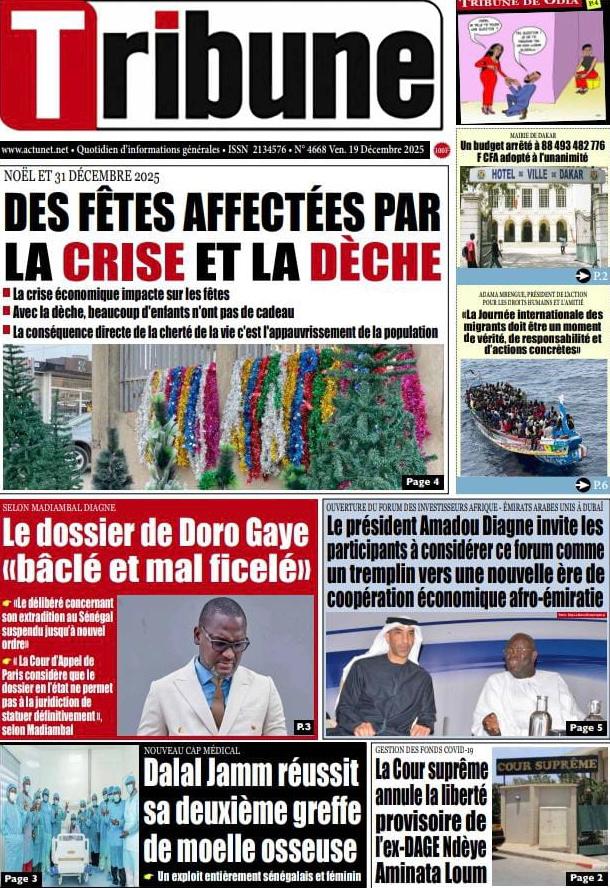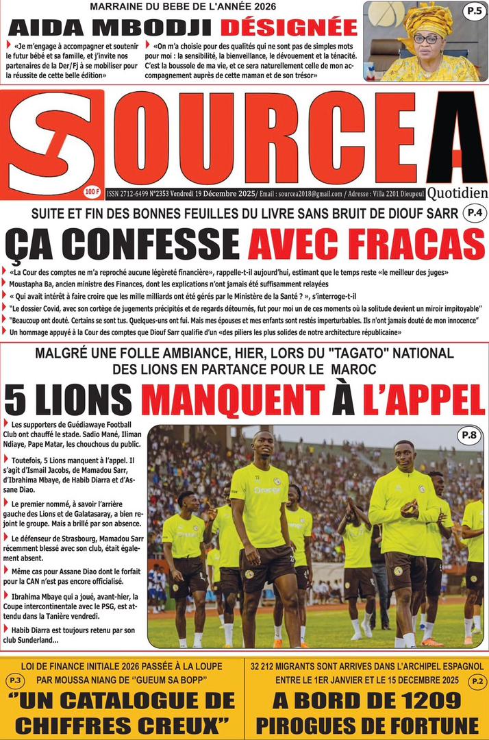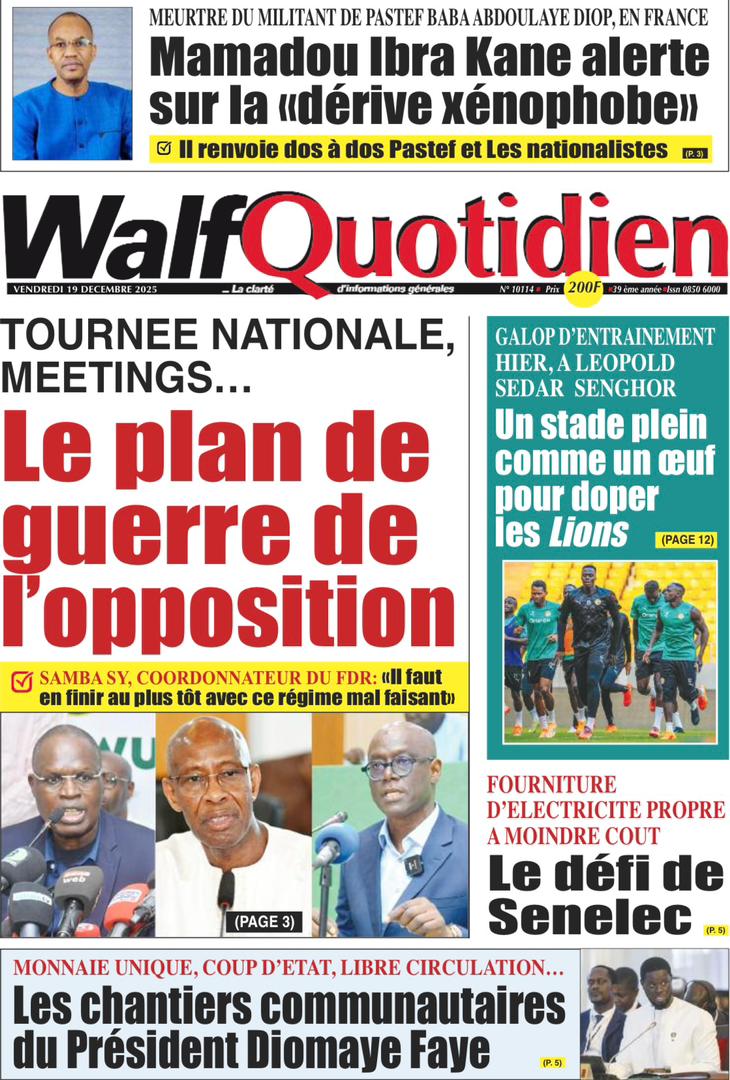 AccueilActualitésDécouvrez les Unes des journaux sénégalais du vendredi 19 décembre 2025 Actualitésmedia Découvrez les Unes des journaux sénégalais du vendredi 19 décembre 2025 Par Rédaction 19 décembre 2025 Partager FacebookTwitterPinterestWhatsApp Découvrez les Unes des journaux sénégalais du vendredi 19 décembre 2025 Partager FacebookTwitterPinterestWhatsApp Articles en relation Actualités Décret : C’est officiel, Bassirou Diomaye Faye se sépare aussi d’El Hadji Malick Mboup 19 décembre 2025 Actualités Surpopulation et conditions de détention : L’administration pénitentiaire dévoile la création de 1390 places et de nouvelles mesures 19 décembre 2025 Actualités CAN Maroc 2025 : Jakobs encore absent à la séance d’entrainement de ce jeudi 19 décembre 2025 LAISSER UN COMMENTAIRE Annuler la réponse Commenter : S'il vous plaît entrez votre commentaire! Nom :* S'il vous plaît entrez votre nom ici Email :* Vous avez entré une adresse email incorrecte! Veuillez entrer votre adresse email ici Site : Enregistrer mon nom, email et site web dans ce navigateur pour la prochaine fois que je commenterai. Current ye@r * Leave this field empty - Advertisment - Most Popular Décret : C’est officiel, Bassirou Diomaye Faye se sépare aussi d’El Hadji Malick Mboup 19 décembre 2025 Surpopulation et conditions de détention : L’administration pénitentiaire dévoile la création de 1390 places et de nouvelles mesures 19 décembre 2025 CAN Maroc 2025 : Jakobs encore absent à la séance d’entrainement de ce jeudi 19 décembre 2025 Modou Diagne Fada dresse un bilan critique des 18 mois du régime Pastef 18 décembre 2025 Voir plus