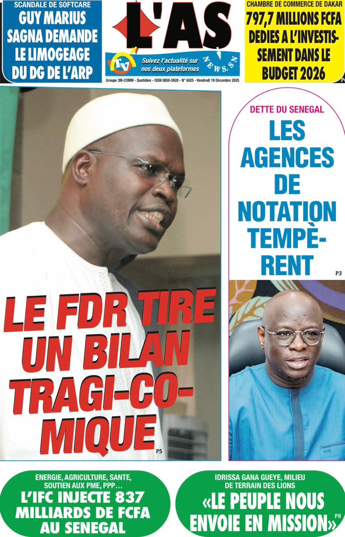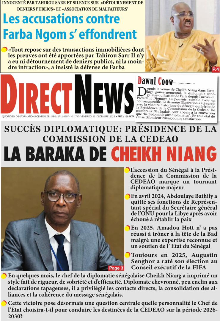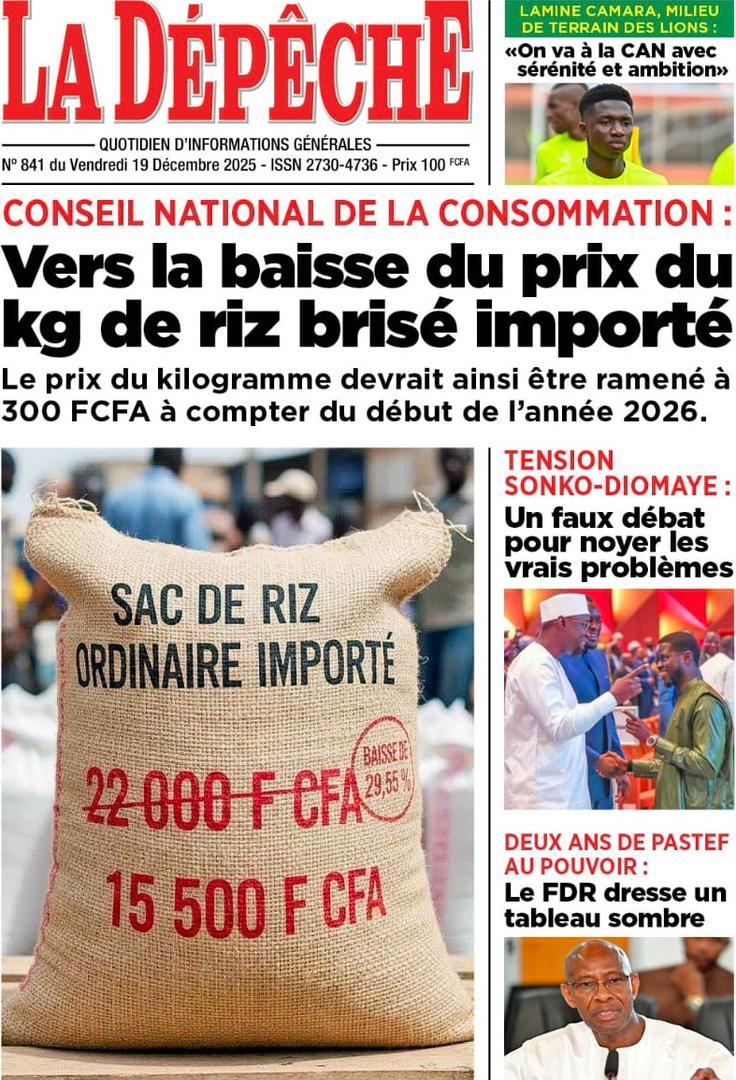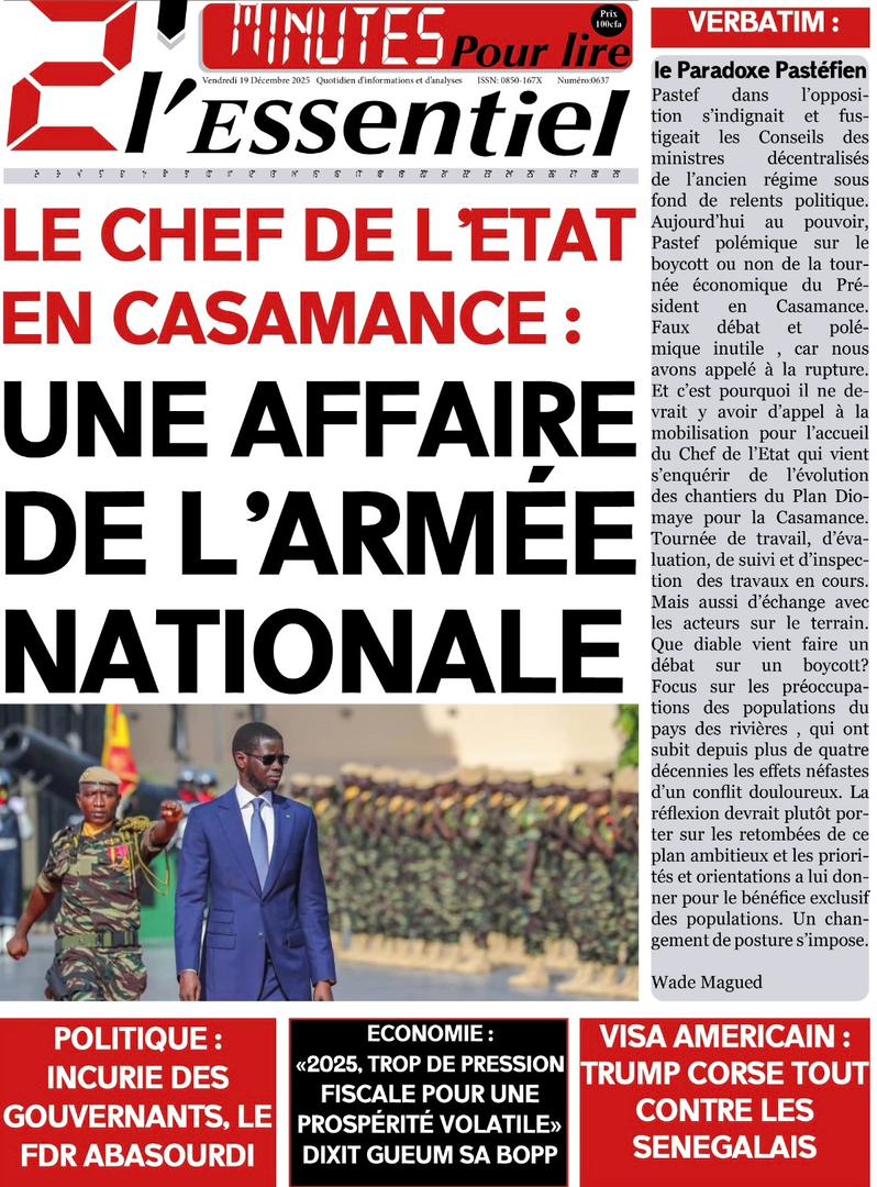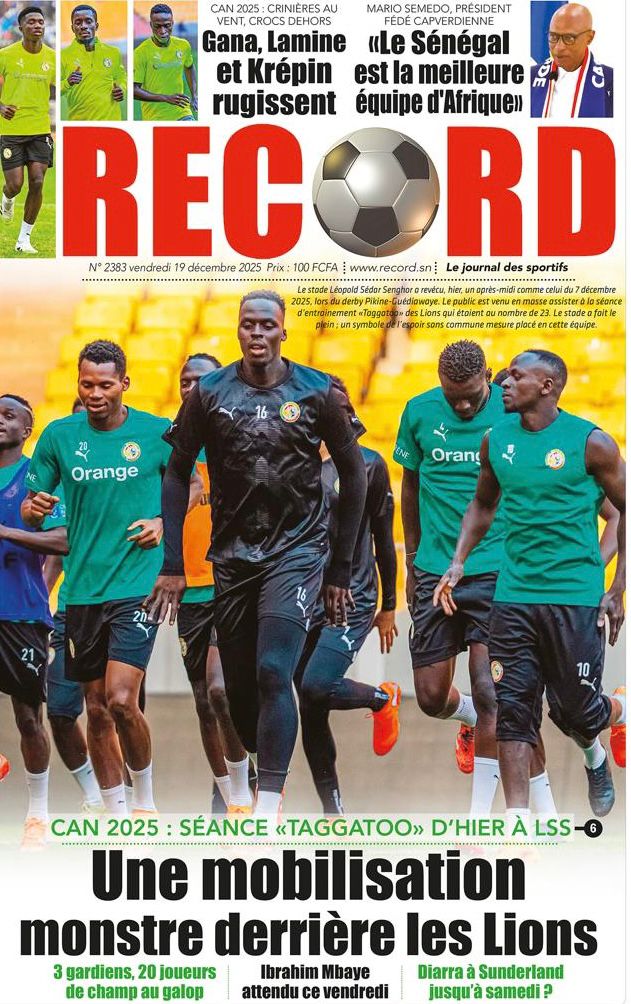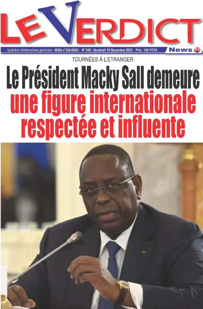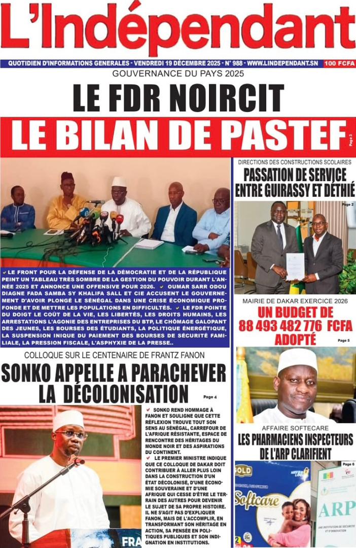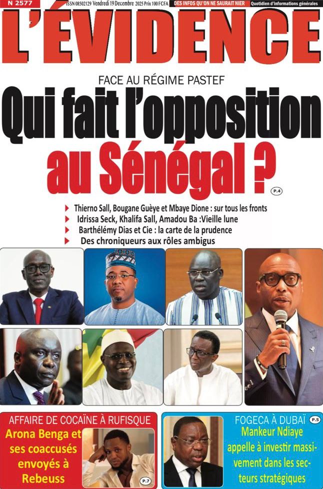 AccueilActualitésDécouvrez les Unes des journaux sénégalais du vendredi 19 décembre 2025 Actualitésmedia Découvrez les Unes des journaux sénégalais du vendredi 19 décembre 2025 Par Rédaction 19 décembre 2025 Partager FacebookTwitterPinterestWhatsApp Découvrez les Unes des journaux sénégalais du vendredi 19 décembre 2025 Partager FacebookTwitterPinterestWhatsApp Articles en relation Actualités Décret : C’est officiel, Bassirou Diomaye Faye se sépare aussi d’El Hadji Malick Mboup 19 décembre 2025 Actualités Surpopulation et conditions de détention : L’administration pénitentiaire dévoile la création de 1390 places et de nouvelles mesures 19 décembre 2025 Actualités CAN Maroc 2025 : Jakobs encore absent à la séance d’entrainement de ce jeudi 19 décembre 2025 LAISSER UN COMMENTAIRE Annuler la réponse Commenter : S'il vous plaît entrez votre commentaire! Nom :* S'il vous plaît entrez votre nom ici Email :* Vous avez entré une adresse email incorrecte! Veuillez entrer votre adresse email ici Site : Enregistrer mon nom, email et site web dans ce navigateur pour la prochaine fois que je commenterai. Current ye@r * Leave this field empty - Advertisment - Most Popular Décret : C’est officiel, Bassirou Diomaye Faye se sépare aussi d’El Hadji Malick Mboup 19 décembre 2025 Surpopulation et conditions de détention : L’administration pénitentiaire dévoile la création de 1390 places et de nouvelles mesures 19 décembre 2025 CAN Maroc 2025 : Jakobs encore absent à la séance d’entrainement de ce jeudi 19 décembre 2025 Modou Diagne Fada dresse un bilan critique des 18 mois du régime Pastef 18 décembre 2025 Voir plus