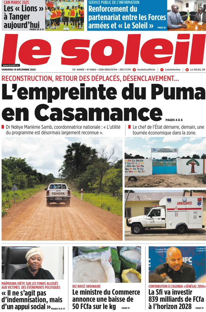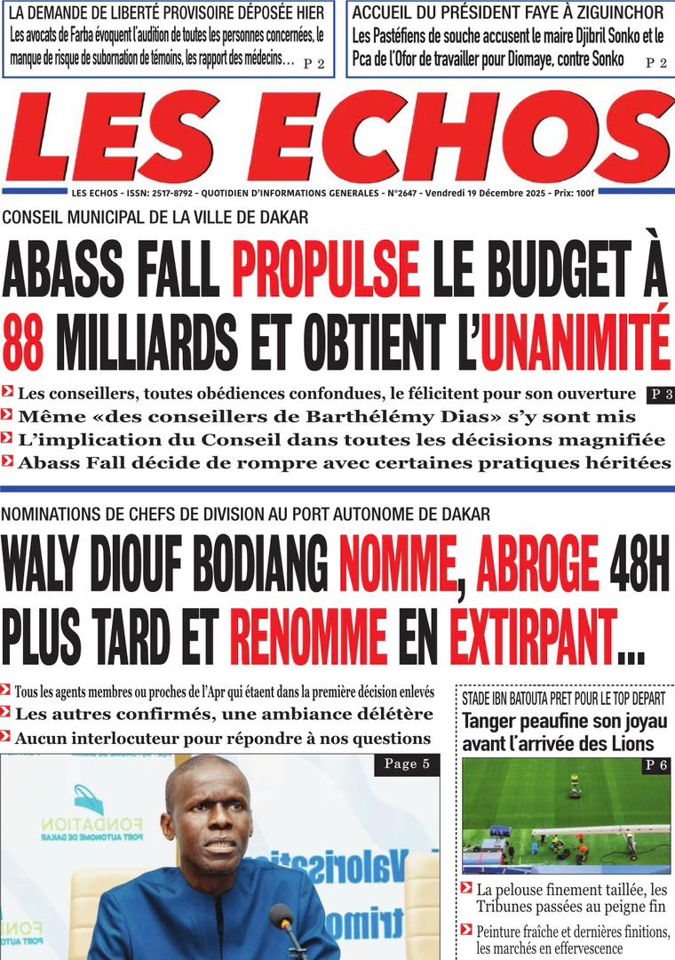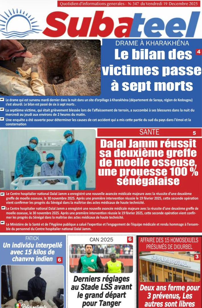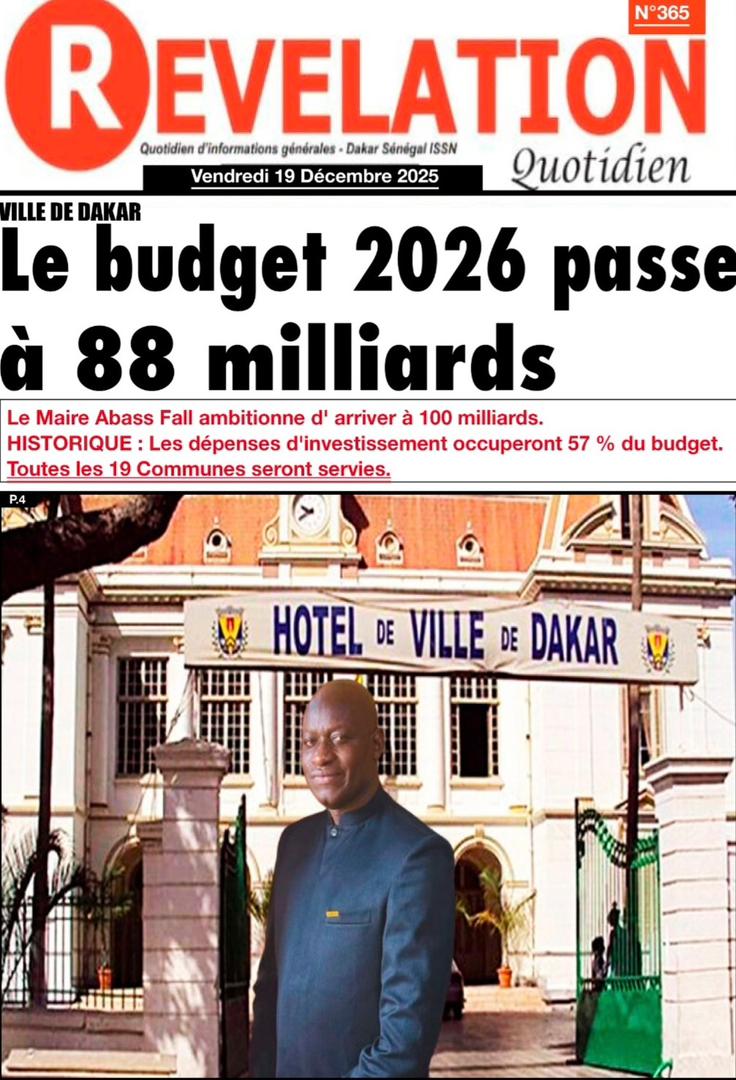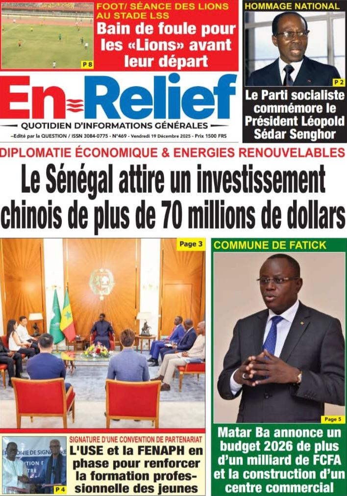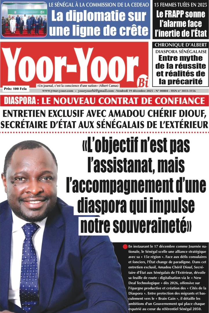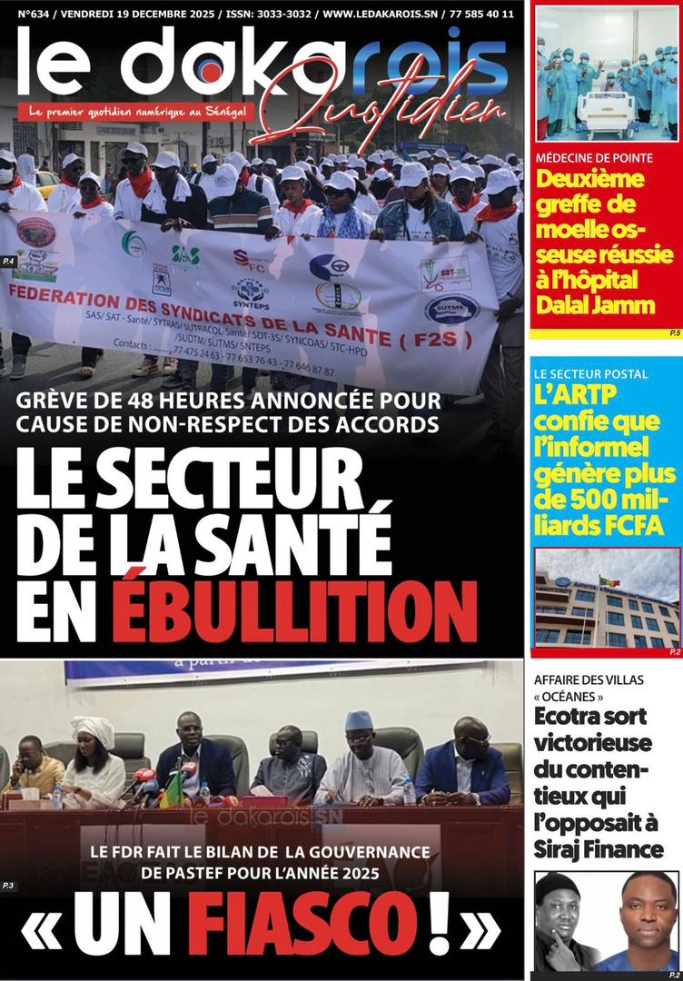 AccueilActualitésDécouvrez les Unes des journaux sénégalais du vendredi 19 décembre 2025 Actualitésmedia Découvrez les Unes des journaux sénégalais du vendredi 19 décembre 2025 Par Rédaction 19 décembre 2025 Partager FacebookTwitterPinterestWhatsApp Découvrez les Unes des journaux sénégalais du vendredi 19 décembre 2025 Partager FacebookTwitterPinterestWhatsApp Articles en relation Actualités Décret : C’est officiel, Bassirou Diomaye Faye se sépare aussi d’El Hadji Malick Mboup 19 décembre 2025 Actualités Surpopulation et conditions de détention : L’administration pénitentiaire dévoile la création de 1390 places et de nouvelles mesures 19 décembre 2025 Actualités CAN Maroc 2025 : Jakobs encore absent à la séance d’entrainement de ce jeudi 19 décembre 2025 LAISSER UN COMMENTAIRE Annuler la réponse Commenter : S'il vous plaît entrez votre commentaire! Nom :* S'il vous plaît entrez votre nom ici Email :* Vous avez entré une adresse email incorrecte! Veuillez entrer votre adresse email ici Site : Enregistrer mon nom, email et site web dans ce navigateur pour la prochaine fois que je commenterai. Current ye@r * Leave this field empty - Advertisment - Most Popular Décret : C’est officiel, Bassirou Diomaye Faye se sépare aussi d’El Hadji Malick Mboup 19 décembre 2025 Surpopulation et conditions de détention : L’administration pénitentiaire dévoile la création de 1390 places et de nouvelles mesures 19 décembre 2025 CAN Maroc 2025 : Jakobs encore absent à la séance d’entrainement de ce jeudi 19 décembre 2025 Modou Diagne Fada dresse un bilan critique des 18 mois du régime Pastef 18 décembre 2025 Voir plus