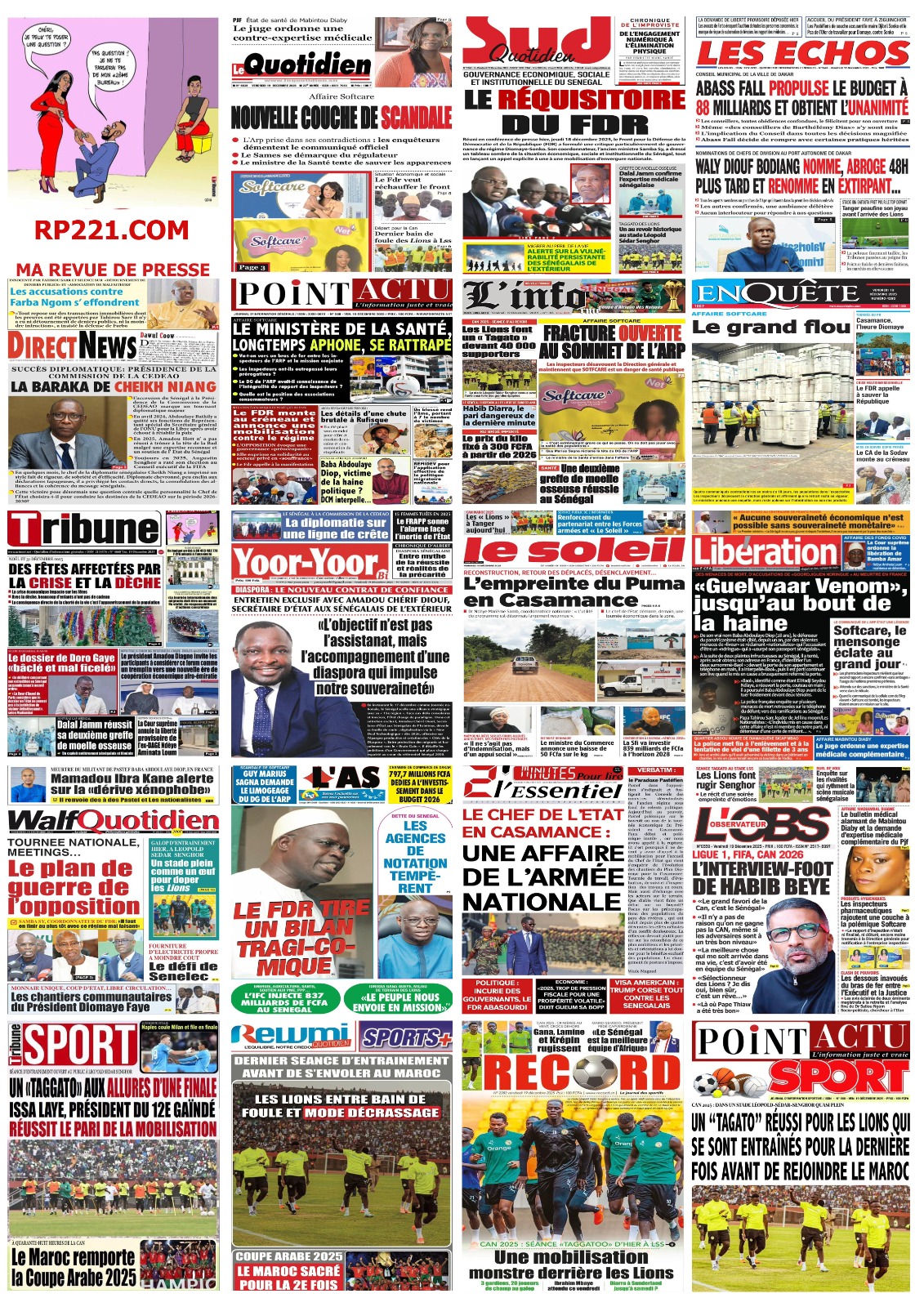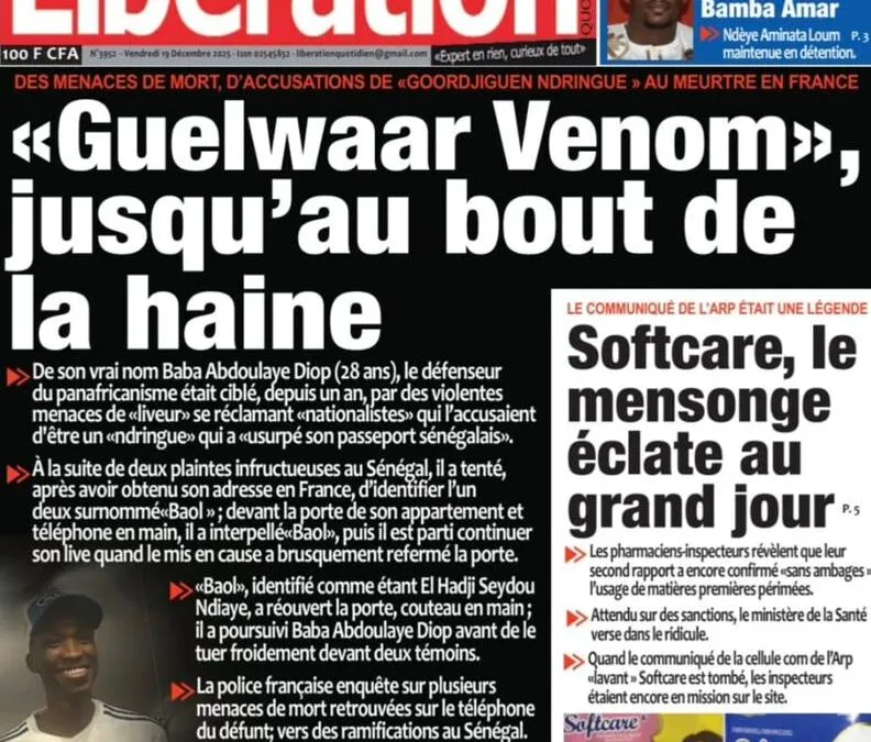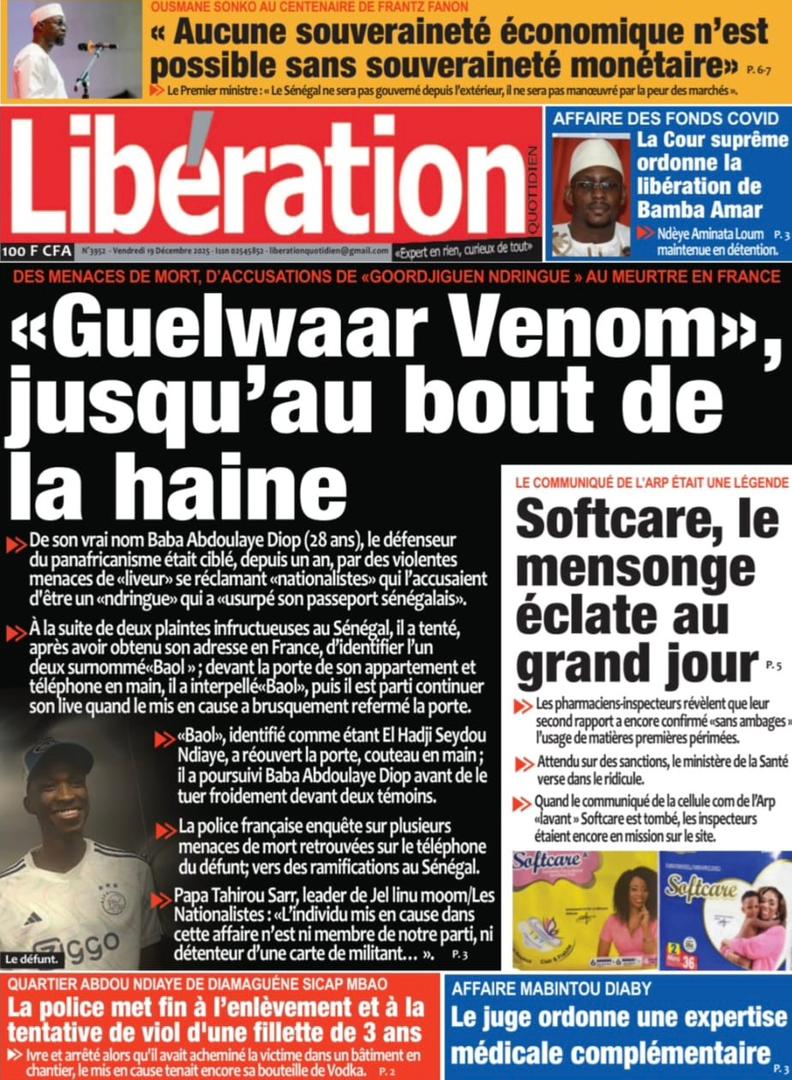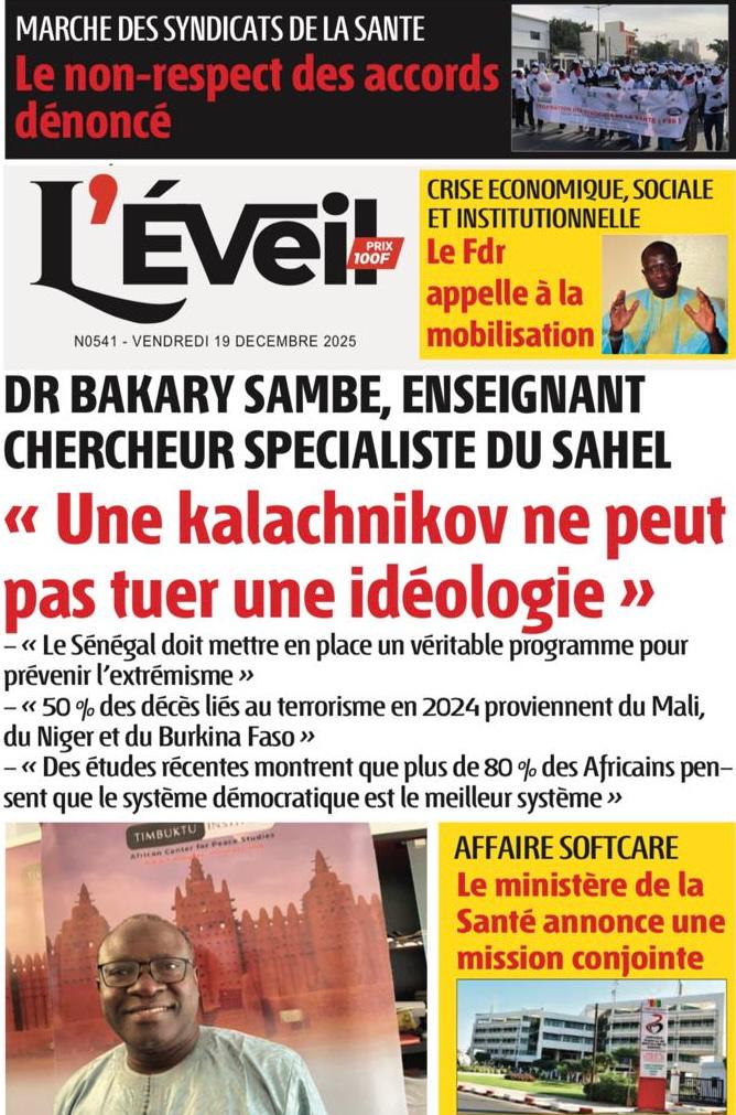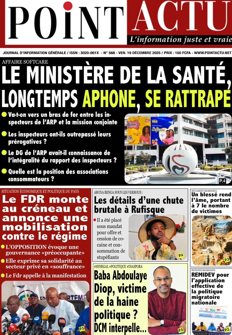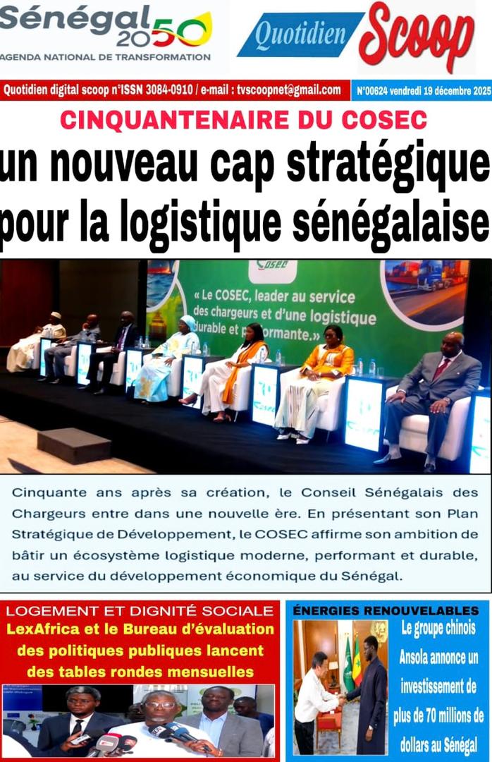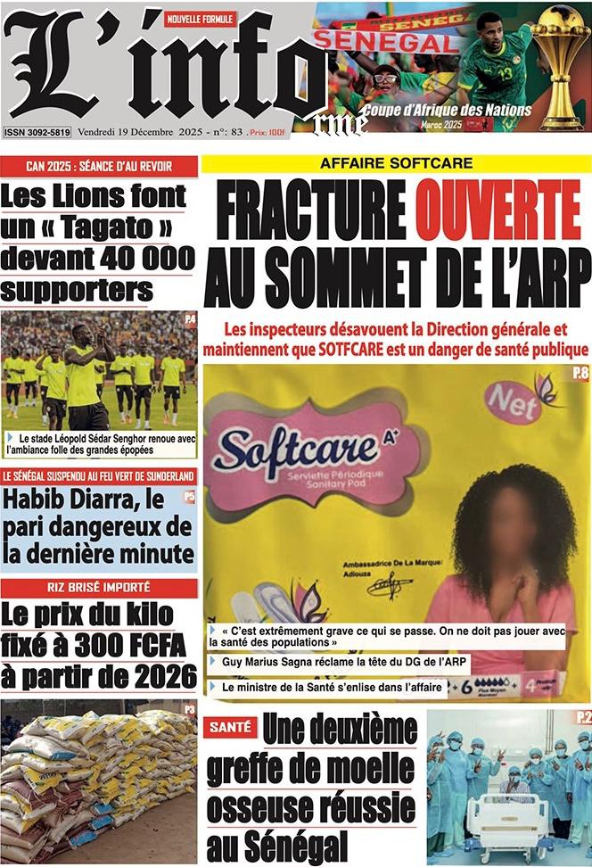 AccueilActualitésDécouvrez les Unes des journaux sénégalais du vendredi 19 décembre 2025 Actualitésmedia Découvrez les Unes des journaux sénégalais du vendredi 19 décembre 2025 Par Rédaction 19 décembre 2025 Partager FacebookTwitterPinterestWhatsApp Découvrez les Unes des journaux sénégalais du vendredi 19 décembre 2025 Partager FacebookTwitterPinterestWhatsApp Articles en relation Actualités Décret : C’est officiel, Bassirou Diomaye Faye se sépare aussi d’El Hadji Malick Mboup 19 décembre 2025 Actualités Surpopulation et conditions de détention : L’administration pénitentiaire dévoile la création de 1390 places et de nouvelles mesures 19 décembre 2025 Actualités CAN Maroc 2025 : Jakobs encore absent à la séance d’entrainement de ce jeudi 19 décembre 2025 LAISSER UN COMMENTAIRE Annuler la réponse Commenter : S'il vous plaît entrez votre commentaire! Nom :* S'il vous plaît entrez votre nom ici Email :* Vous avez entré une adresse email incorrecte! Veuillez entrer votre adresse email ici Site : Enregistrer mon nom, email et site web dans ce navigateur pour la prochaine fois que je commenterai. Current ye@r * Leave this field empty - Advertisment - Most Popular Décret : C’est officiel, Bassirou Diomaye Faye se sépare aussi d’El Hadji Malick Mboup 19 décembre 2025 Surpopulation et conditions de détention : L’administration pénitentiaire dévoile la création de 1390 places et de nouvelles mesures 19 décembre 2025 CAN Maroc 2025 : Jakobs encore absent à la séance d’entrainement de ce jeudi 19 décembre 2025 Modou Diagne Fada dresse un bilan critique des 18 mois du régime Pastef 18 décembre 2025 Voir plus