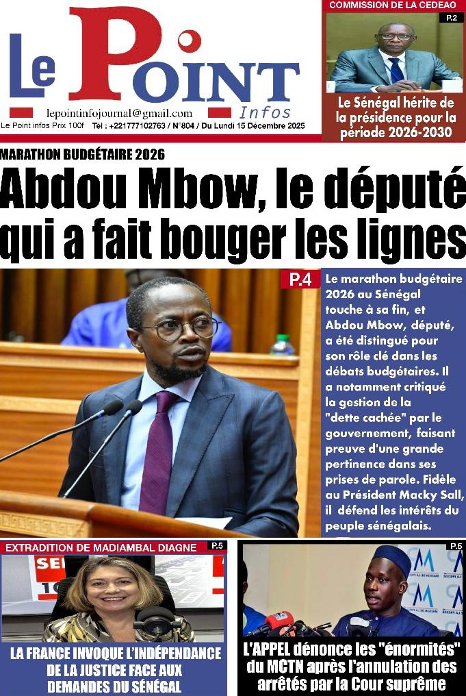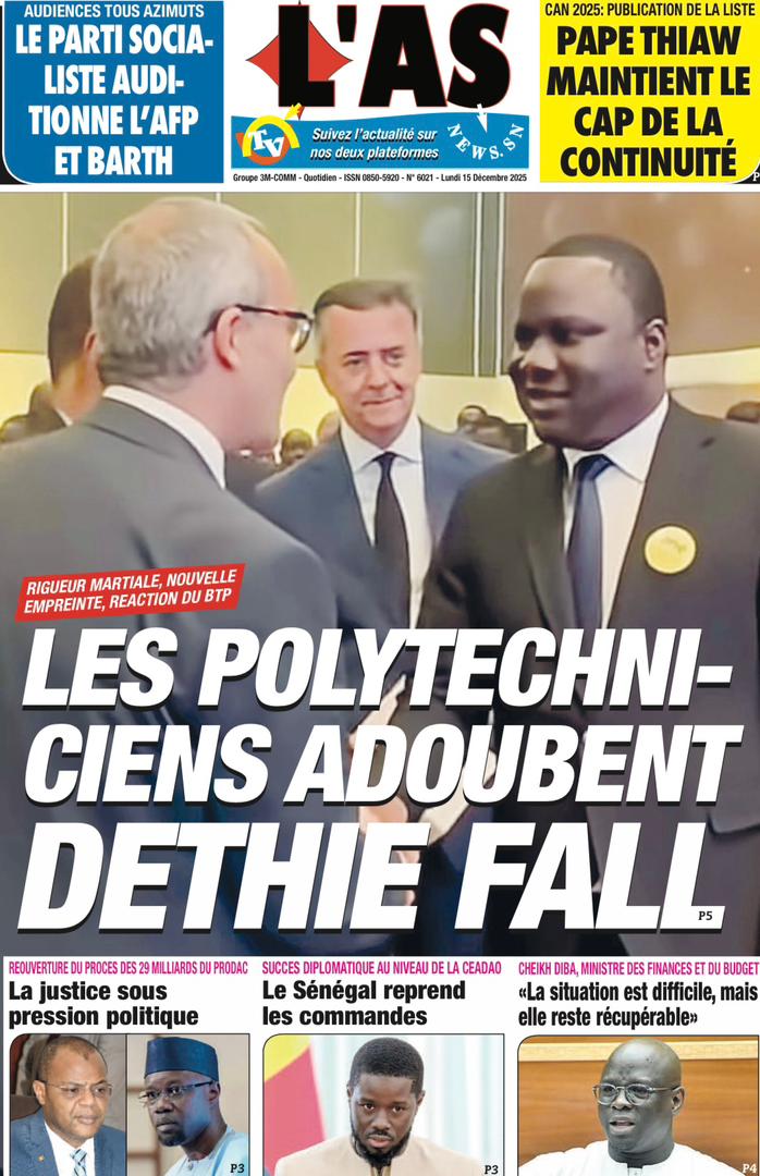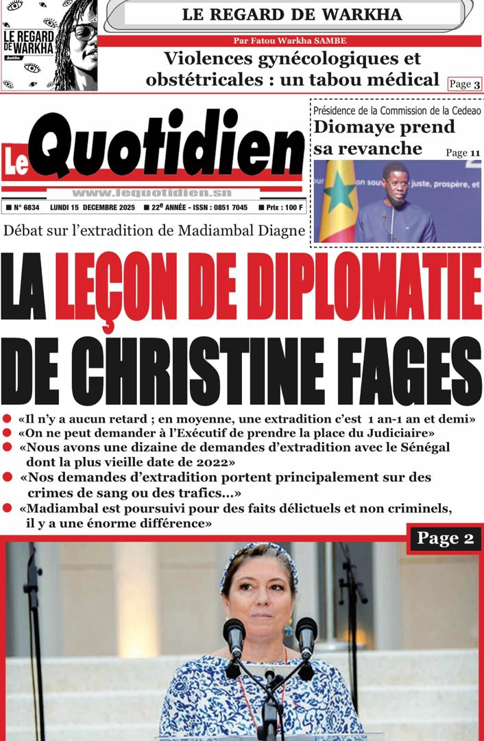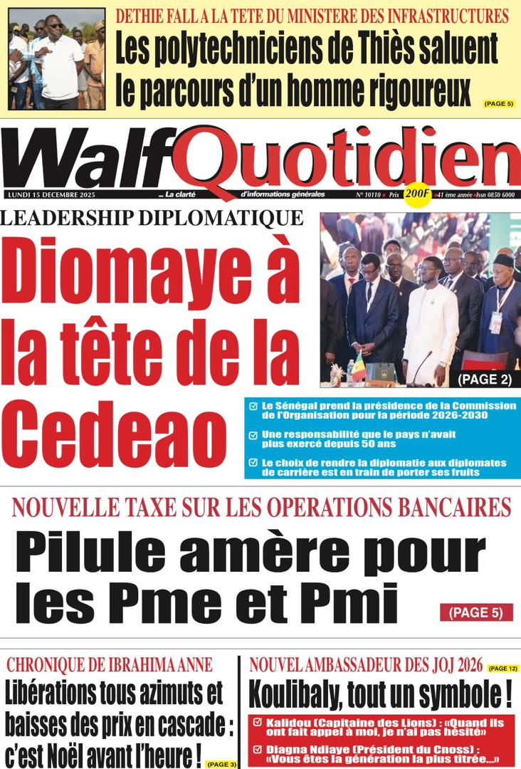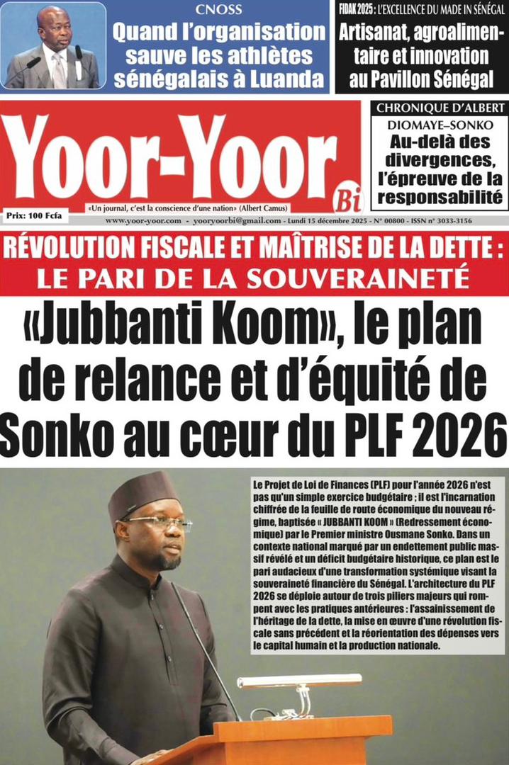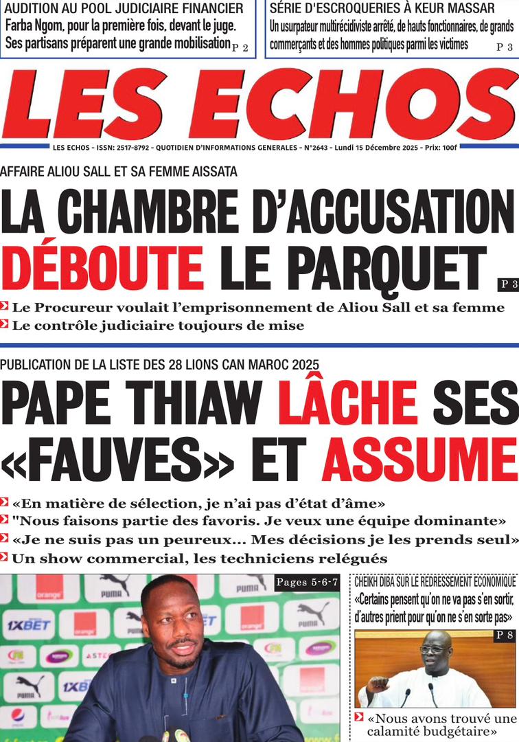 AccueilActualitésLa Une Des Quotidiens - Lundi 15 décembre 2025 (Avec Ma Revue... Actualités La Une Des Quotidiens – Lundi 15 décembre 2025 (Avec Ma Revue De Presse) Par Samba Kane 15 décembre 2025 Partager FacebookTwitterPinterestWhatsApp TagsUne des journaux Partager FacebookTwitterPinterestWhatsApp Articles en relation A LA UNE Pool judiciaire financier : Affaire Farba NGOM – L’Adjoint au Maire Fait Trembler le Sommet de l’État 15 décembre 2025 A LA UNE EXCLUSIF : Farba Ngom Face à la Justice – L’Arrivée Tendue au Pôle Financier qui Secoue la République 15 décembre 2025 Actualités Pool judiciaire financier : Farba Ngom comparaît pour son audition dans le fond 15 décembre 2025 LAISSER UN COMMENTAIRE Annuler la réponse Commenter : S'il vous plaît entrez votre commentaire! Nom :* S'il vous plaît entrez votre nom ici Email :* Vous avez entré une adresse email incorrecte! Veuillez entrer votre adresse email ici Site : Enregistrer mon nom, email et site web dans ce navigateur pour la prochaine fois que je commenterai. Current ye@r * Leave this field empty - Advertisment - Most Popular Pool judiciaire financier : Affaire Farba NGOM – L’Adjoint au Maire Fait Trembler le Sommet de l’État 15 décembre 2025 EXCLUSIF : Farba Ngom Face à la Justice – L’Arrivée Tendue au Pôle Financier qui Secoue la République 15 décembre 2025 Pool judiciaire financier : Farba Ngom comparaît pour son audition dans le fond 15 décembre 2025 L’implacable « Coup de Gueule » de Top : Où sont les responsables de 2021-2024 ? L’éclipse d’Antoine Diome, symptôme d’une rupture manquée 14 décembre 2025 Voir plus