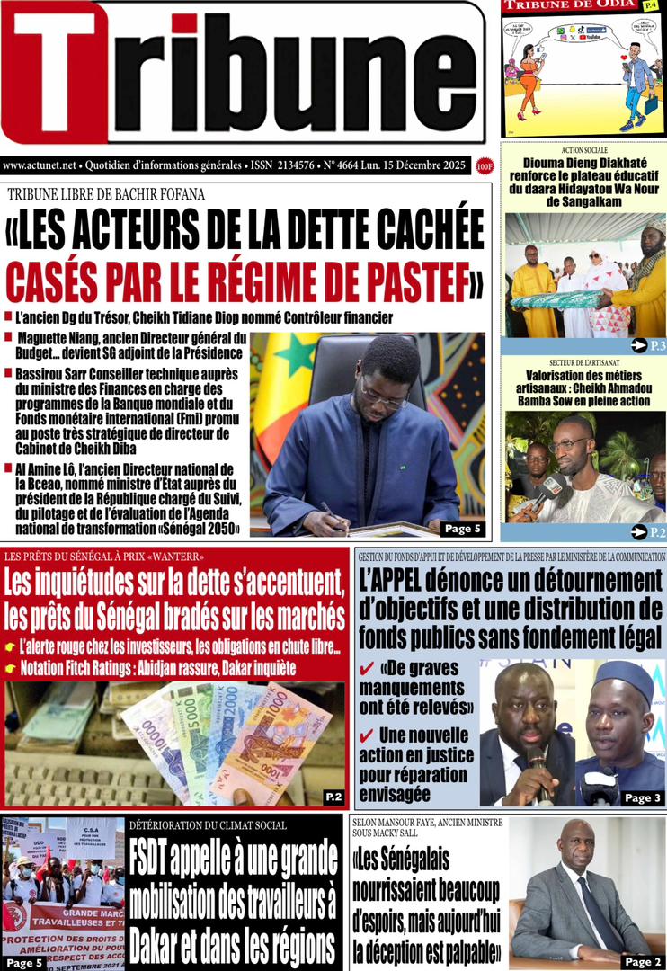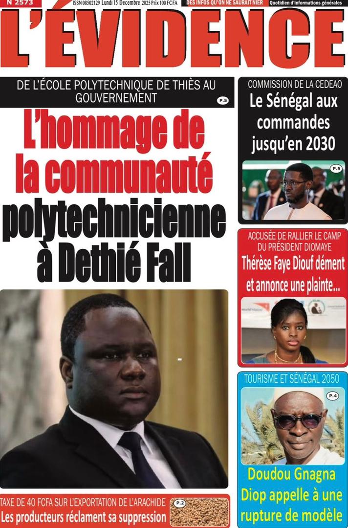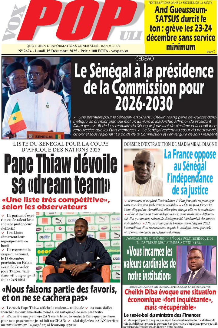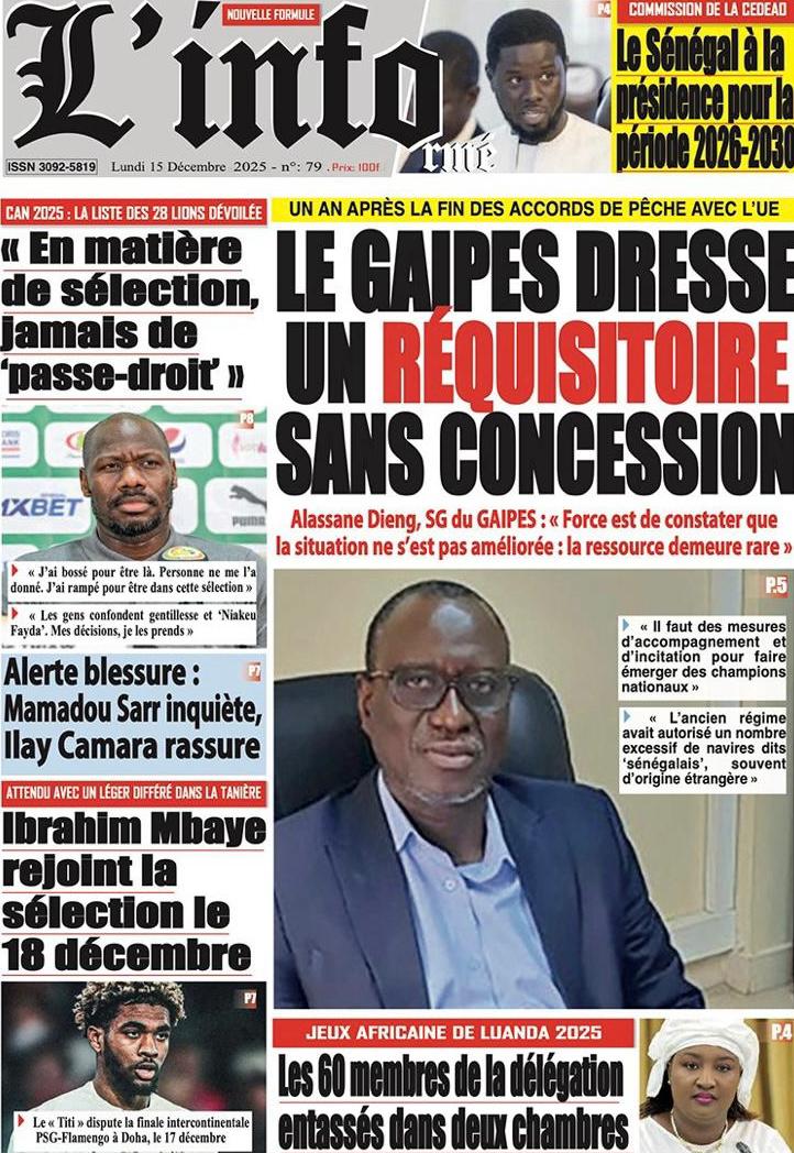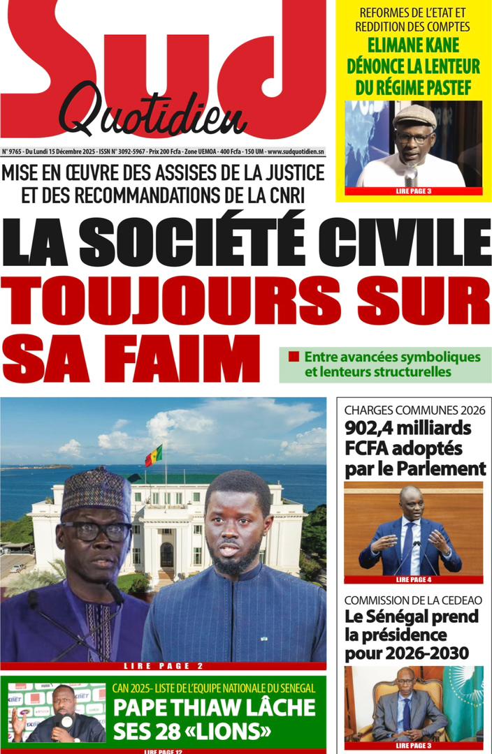 AccueilActualitésLa Une Des Quotidiens - Lundi 15 décembre 2025 (Avec Ma Revue... Actualités La Une Des Quotidiens – Lundi 15 décembre 2025 (Avec Ma Revue De Presse) Par Samba Kane 15 décembre 2025 Partager FacebookTwitterPinterestWhatsApp TagsUne des journaux Partager FacebookTwitterPinterestWhatsApp Articles en relation A LA UNE Pool judiciaire financier : Affaire Farba NGOM – L’Adjoint au Maire Fait Trembler le Sommet de l’État 15 décembre 2025 A LA UNE EXCLUSIF : Farba Ngom Face à la Justice – L’Arrivée Tendue au Pôle Financier qui Secoue la République 15 décembre 2025 Actualités Pool judiciaire financier : Farba Ngom comparaît pour son audition dans le fond 15 décembre 2025 LAISSER UN COMMENTAIRE Annuler la réponse Commenter : S'il vous plaît entrez votre commentaire! Nom :* S'il vous plaît entrez votre nom ici Email :* Vous avez entré une adresse email incorrecte! Veuillez entrer votre adresse email ici Site : Enregistrer mon nom, email et site web dans ce navigateur pour la prochaine fois que je commenterai. Current ye@r * Leave this field empty - Advertisment - Most Popular Pool judiciaire financier : Affaire Farba NGOM – L’Adjoint au Maire Fait Trembler le Sommet de l’État 15 décembre 2025 EXCLUSIF : Farba Ngom Face à la Justice – L’Arrivée Tendue au Pôle Financier qui Secoue la République 15 décembre 2025 Pool judiciaire financier : Farba Ngom comparaît pour son audition dans le fond 15 décembre 2025 L’implacable « Coup de Gueule » de Top : Où sont les responsables de 2021-2024 ? L’éclipse d’Antoine Diome, symptôme d’une rupture manquée 14 décembre 2025 Voir plus