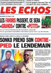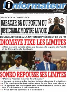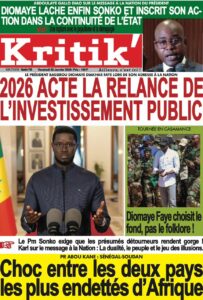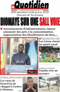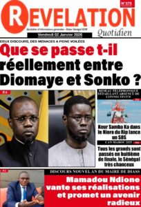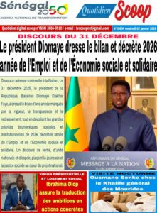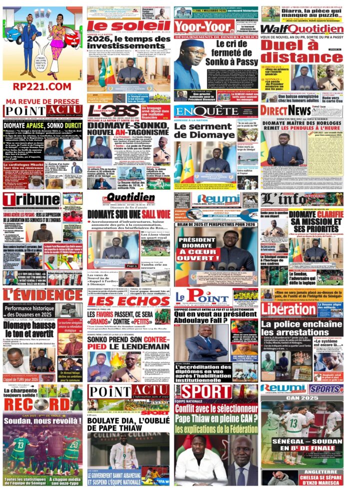 AccueilACCIDENTles UNES des Quotidiens nationaux du Vendredi 2 janvier 2026 ACCIDENTActualitésculturedécisiondrameeconomieEducationenergiejusticemediasPolitiquePR DIOMAYE FAYEsanteSociétéSportsTransport les UNES des Quotidiens nationaux du Vendredi 2 janvier 2026 Par Rédaction 2 janvier 2026 Partager FacebookTwitterPinterestWhatsApp TagsactualitésActualités au SénégalinformationsjournauxUne des journauxunes du jour Partager FacebookTwitterPinterestWhatsApp Articles en relation Actualités Justice et Réparation : Le cri du cœur du Collectif des ex-détenus politiques (2021-2024) 2 janvier 2026 Actualités Officiel : Kalidou Koulibaly connaît sa sanction. Le Sénégal retient son souffle 2 janvier 2026 Actualités CAN 2025 : L’heure de vérité a sonné ! Le tableau des 8es est là, place au frisson 2 janvier 2026 LAISSER UN COMMENTAIRE Annuler la réponse Commenter : S'il vous plaît entrez votre commentaire! Nom :* S'il vous plaît entrez votre nom ici Email :* Vous avez entré une adresse email incorrecte! Veuillez entrer votre adresse email ici Site : Enregistrer mon nom, email et site web dans ce navigateur pour la prochaine fois que je commenterai. Current ye@r * Leave this field empty - Advertisment - Most Popular Justice et Réparation : Le cri du cœur du Collectif des ex-détenus politiques (2021-2024) 2 janvier 2026 Officiel : Kalidou Koulibaly connaît sa sanction. Le Sénégal retient son souffle 2 janvier 2026 CAN 2025 : L’heure de vérité a sonné ! Le tableau des 8es est là, place au frisson 2 janvier 2026 Touba : Le huis clos nocturne d’Ousmane Sonko chez le Patriarche de Darou Miname 2 janvier 2026 Voir plus