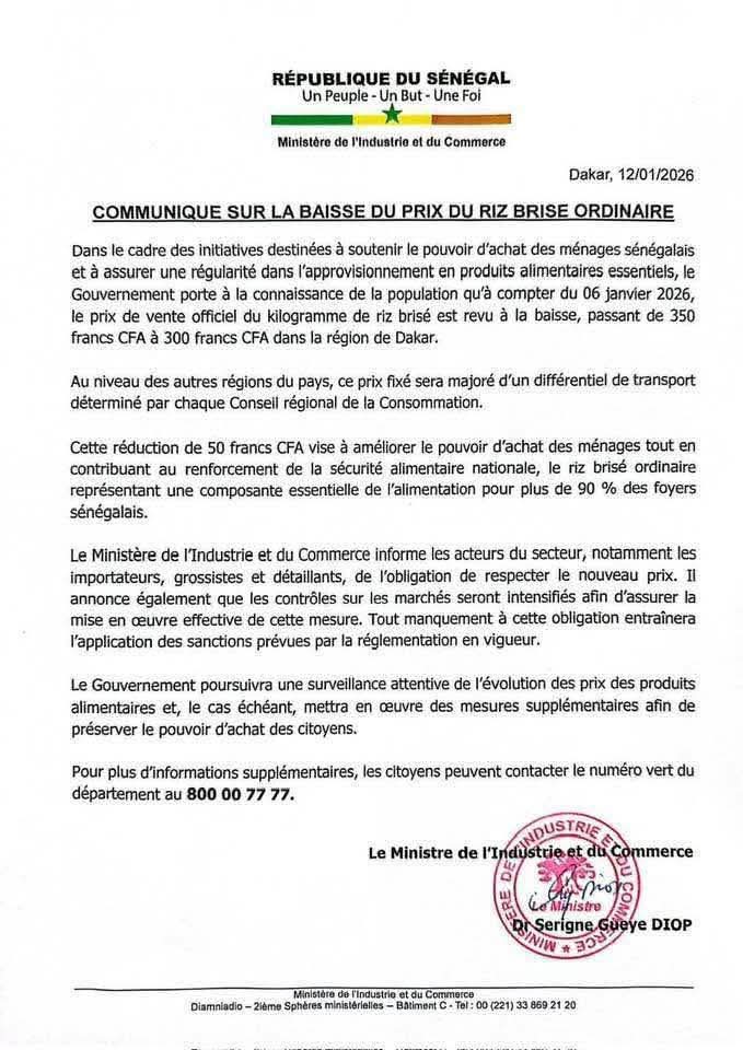 C’est la nouvelle que des millions de ménages attendaient. Depuis ce 6 janvier 2026, le kilogramme de riz brisé ordinaire — base de l’alimentation nationale — connaît une baisse significative à Dakar. En fixant le prix à 300 FCFA, l’exécutif envoie un signal fort : la lutte contre la vie chère n’est plus une promesse, c’est une réalité de marché.