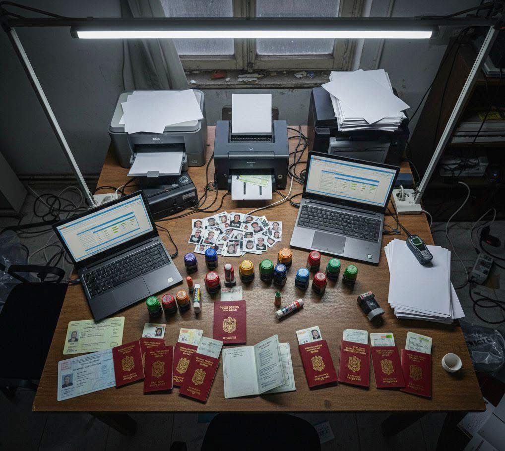 Sur place, la scène dépasse la simple petite magouille. Les policiers tombent sur un véritable « laboratoire » en pleine activité. Cinq individus sont surpris en flagrant délit, entourés de documents de voyage et d’un arsenal technologique dédié à la contrefaçon.